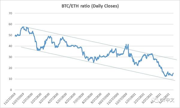 数据显示,5月19日崩盘后,比特币和以太坊之间的巨大价格差异开始趋于平缓。Lifshitz称这是比特币将比以太坊更有价值的又一个迹象。