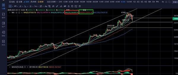 BTC3天的累计跌幅接近1万点,已经是有史以来最大的跌幅。因为BTC的高价格,导致接近万点的跌幅,从比例上看只下跌了22%。3万美元大关是BTC短期需要守住的关键位置,也是多头重点防守的区域,如果放量跌破3万美元,将会迎来踩踏行情,市场恐慌情绪下会进一步蔓延,如果插针28000美元,再收回3万美元上方,是布局长线趋势的绝佳位置。从整体上涨结构看,BTC目前依然在通道运行,长线结构仍然处于强势,今天下跌短时触碰趋势下沿,也是6小时MA60位置,然后开始反弹。后续需要持续关注趋势线是否能够为BTC价格提供持续支撑,如果跌破,证明一段持续上涨的行情进入调整阶段,如果能在趋势线上方企稳,后续上涨结构会继续延续。从6小时MACD看,前期的上涨没有出现背离,而这两天的下跌也并未出现背离,这就证明近期的市场上涨和下跌都是良性的上涨和良性的下跌。今天需要关注短期压力位36500,短期支撑32850(6小时MA30),中期支撑28000(6小时MA120)