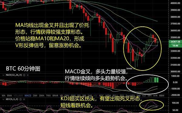 行情先留意回调机会再布局多单,关注33000-33200区间做多,目标33900-34800,止损32800;行情再次触及36000附近阻力可留意短线看跌机会。