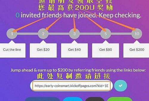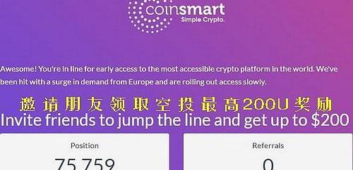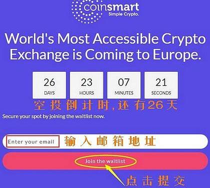 推特上找的。最便捷的加密货币交易所即将来到欧洲!现在邮箱注册,加入CoinSmart的候补名单,按邀请数量,可获10-200U不等的奖励。交易所空投建议参与下,不要错过。暂时无需KYC。空投领取入口:https://early-coinsmart.kickoffpages.com?kid=1EFHVF领取步骤:1,打开上面空投链接,填写邮箱并提交: