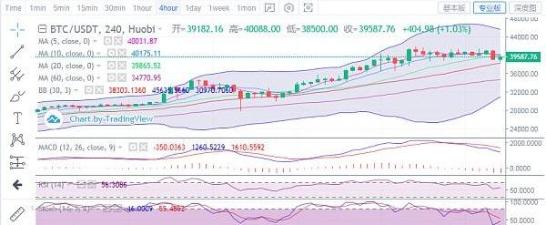比特币午间走了一波冲高回落,晚间价格再次下探,低位触及38500位置后止跌随后反弹,上行至40088位置后承压回落,目前价格运行在39590附近