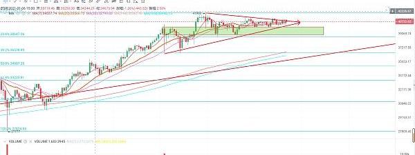 从趋势的角度,比特币的趋势依旧是往上的,高位横盘震荡,更像是在蓄力。关注是往上一根大阳线,带领行情更加疯狂,还是往下一根大阴线,给疯狂的市场降温。往下回调关注36000——38000美金的支撑,往上走,估计就要看5万美金。
