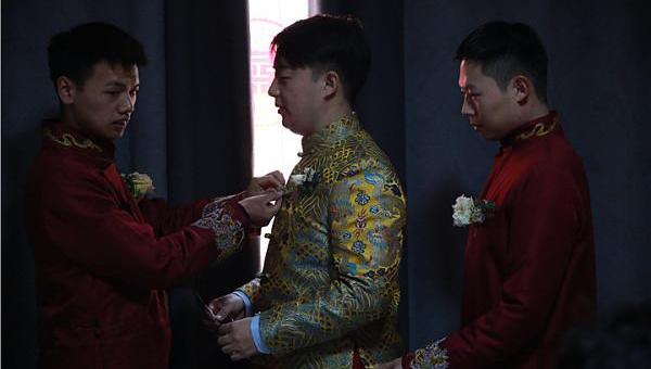 伴郎整理新郎服饰。徐云龙郭莎莎摄