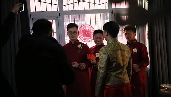 新娘闺蜜团把门索要红包。徐云龙郭莎莎摄