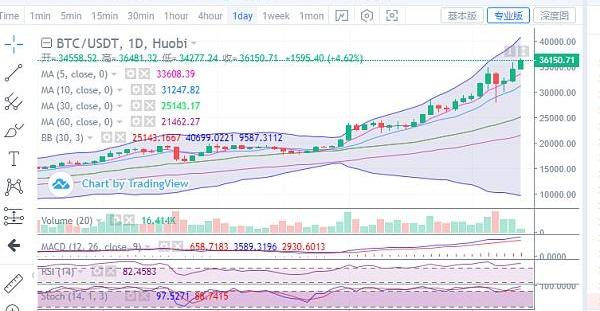 比特币昨日涨幅4000点,新高之后虽然出现深度回调,但是后续修复力度强劲,整体上行趋势斌并未改变。日内凌晨走势延续上行,价格是再度攀升刷新历史高位点,目前行情如期上涨至36000区域,多头情绪浓重,日内价格有进一步上行的趋势。