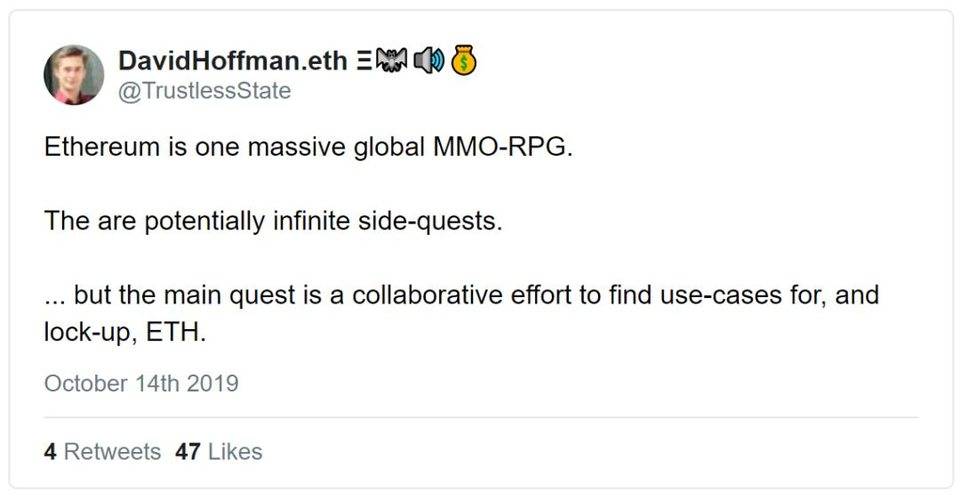 让 ETH 更有用的应用被 ETH 持有者更多使用,并创造了一个良性循环。拥有 ETH 的用户可以从让用户利用其 ETH 余额的以太坊应用中获益。因为有一群 ETH 持有者需要理由来使用他们的 ETH,那些将 ETH 作为资本资产的应用程序从那些对以太坊生存和 ETH 价值感兴趣的特定人群中得到了超额的采用,这个人群就是 ETH 持有者。