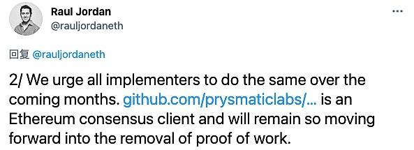 与此同时,Eth2 客户端 Prysm 的开发团队 Prysmatic Labs 开始从其代码库中删除所有关于 Eth2 这个用词的痕迹,并呼吁其他开发团队也这样做。