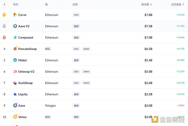 DeFi项目锁定资产前十排名及锁仓量,数据来源:Debank