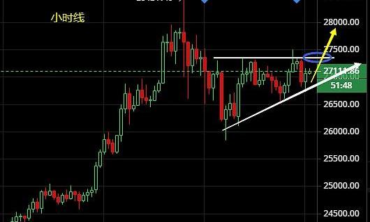 日内比特币主要以震荡为主,经过隔日的冲高回落,这波短线的强势已经转弱,但是多头趋势并没有受到影响,在隔日凌晨探25850一线后小时线还是处于一个震荡上升的节奏当中,并且晚间一度拉升突破日内关键短线阻力27300一线的压制,遗憾的是未能有效站稳,因此也导致了多头无法延续,小时线短线冲高27500后阴线回撤,但回撤力度不强,且也没有连续,订阅工众号冯楚昊认为如果凌晨能够再度突破企稳日内阻力27300,短线多头还是具备拉升条件。