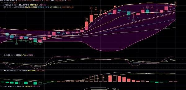 四小时幅图指标KDJ在超买区域开始拐头向下,短周期有回调的需求,但是日内大方向依然看涨,稳健可以等待回调继续布局多单进场,下方关注24200一线支撑位,其次关注23500-24000日线支撑位。