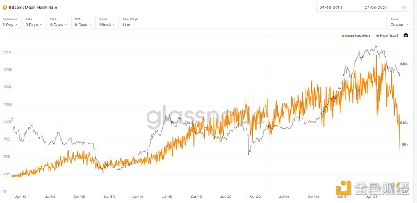 自中国政府一刀切打击比特币挖矿以来,比特币全网算力连续下跌,目前已经自峰值大跌近70%。