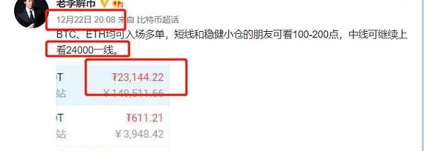 12.22日上午11:19时老李全网给出BTC22500附近多单,14:10时到达入场点位22500,22:00时到达目标点位23500附近止盈出局获利1000点