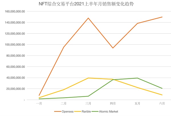 从下图的每月销售额我们可以看出,Opensea在上半年每月的销售额在综合交易平台里排名都是第一,并在三月跟六月都达到了一亿四千万美元的销售额巅峰,大幅度超过其它的综合交易平台。