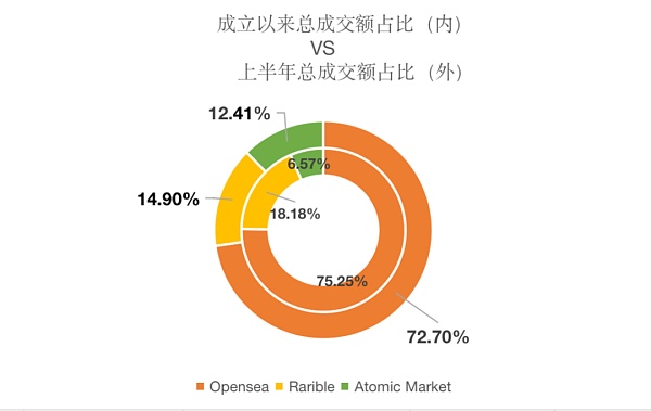 而从市场份额占比变化来看,原本排名第二的Rarible的市场份额从18.18%下降到12.41%,与此同时,Atomic Market的市场份额从6.57%增加到了14.9%,几乎是一倍的增长,在四月前的占比一直低于Opensea与Rarible, 但在四月后,连续三个月的成交额占比超过Rarible,位居第二名,而第一名的Opense从年初一月的59.57%的市场占比在六月的时候升到了83.5%,将近30%的涨幅,稳坐综合交易平台销售额的第一。