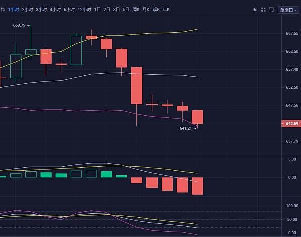 ??行情分析:小时级别来看,以太坊凌晨冲高触压670附近回调震荡下行,触底二次反抽多头未能延续,币价持续震荡下挫插针刺破下轨支撑,在642附近触底小幅反弹,技术上,MA5下穿大级别均线死叉向下,MACD空头柱能逐步增强,快慢零轴上方死叉下移,KDJ死叉向下,J线进入超卖区拐头平行,目前行情进入了短期震荡整理状态,整体趋势依然偏空。但也明显看出下跌能量不足?白盘操作建议在640附近做多