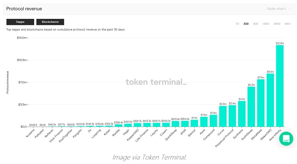Token Terminal报告,Axie Infinity在过去30天里产生了价值近1300万美元的协议收入。这远远超过了同一时期的顶级DeFi项目Maker(840万美元)、Sushi(630万美元)和Synthetix(410万美元),成为了最赚钱的NFT项目(没有之一)!