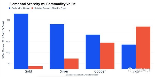 尽管黄金闪亮且在电子产品中广为应用,但其他的金属(如铜)也是如此。但铜只占黄金价格的很小部分;在元素稀缺性和商品价值之间存在反比关系。黄金非常稀少,仅占地壳的0.00000031%,而每盎司的成本却超过1,500美元。
