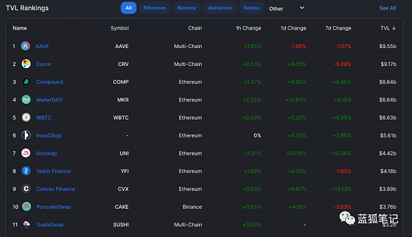 从目前看,Curve的TVL(锁定资产总价值)达到91.7亿美元,接近于第一位的AAVE,按照当前趋势,Curve的TVL在未来一段时间有一定的概率超过AAVE位居首位。