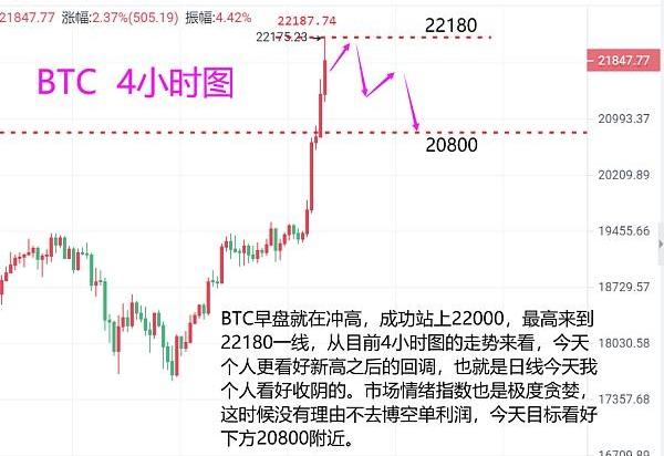 12-17比特币晚盘行情解析比特币下午继续上攻,大阳线直插云霄,暴涨获利兑现,跟上就是赚上,再次印证,币价在22500布局多单,如期涨至22800一线拿下三百点利润.