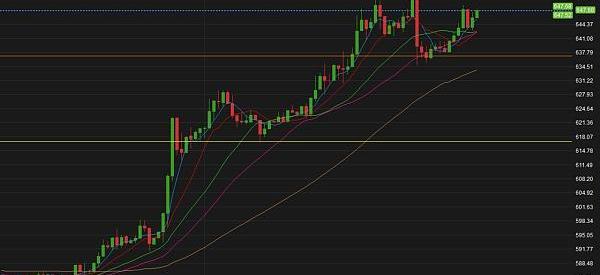 ETH一小时线突破先前预画关卡617.17美元,并突破日线前高637.16美元,午间最高收报652.12美元,行情短暂回落于638.44美元,短线出现超买讯号。