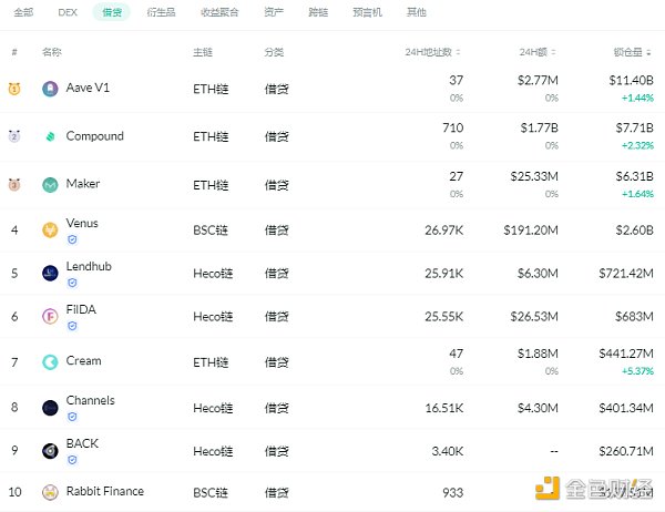 锁仓量排名前十的借贷平台 排名来源:DeFibox