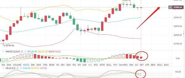 截止目前币价最高是到了22800附近,行情走势非常的强势。小时图来看,布林带开口成向上张口姿态,目前行情受阻在22900附近调整,价格回落200多点,多头有转弱迹象,后续谨防价格反转下跌,建议不要盲目追涨,回调多单更为稳健,短期支撑位是22950附近。