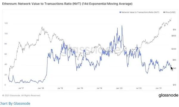 下跌趋势看涨。这意味着网络上发生的交易的增长速度超过了市值的增长速度。一个简单的图表或以太坊可以告诉我们随着时间的推移,我们需要知道的一切。可以看到在2021年1月,我们可以看到灰色价格上升,但NVT下降,这是非常乐观的。