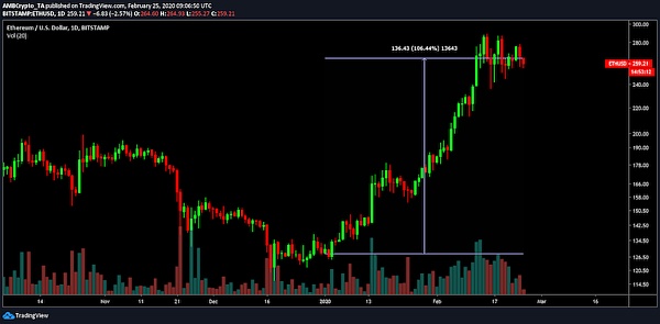 据AMBcrypto 2月26日报道,对于那些刚刚进入数字资产市场、不了解任何行业信息的新投资者来说,他们可能会更倾向于购买以太坊。因为到2020年,这个全球第二大加密货币资产的价值增长了106.44%,超过了比特币等其他货币。尽管在过去两周,以太坊的价格出现了大幅下跌,但其总体人气依然乐观。