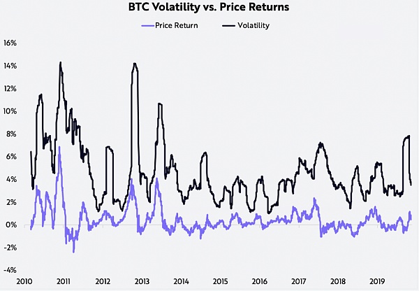 也就是说,比特币的波动性随着时间的推移而减少,如下所示。随着其采用率的提高,对比特币的边际需求应该成为其总网络价值的较小百分比,从而减少价格波动的幅度。在其他条件相同的情况下,例如,100 亿美元市值或网络价值的 10 亿美元新需求对比特币价格的影响应该比 1000 亿美元网络价值的 10 亿美元新需求影响更大。重要的是,我们认为波动不应排除比特币作为一种价值储存手段,主要是因为它通常与价格的大幅上涨同时发生。