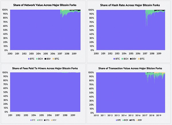 就比特币而言,我们认为网络效应不仅包括专用于保护区块链的哈希率,还包括比特币的流动性和支持其采用和使用的基础设施。如果稀释,分叉将不得不分享比特币的算力、用户和流动性。如下图所示,比特币现金和其他分叉似乎未能破坏比特币的网络效应。