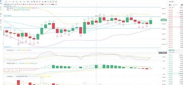 日内以太一直处于缓步上升的趋势,不过并不强势,上方最高来到560上方,但都迫于压力位而又迅速的下跌到560下方,目前在557位置