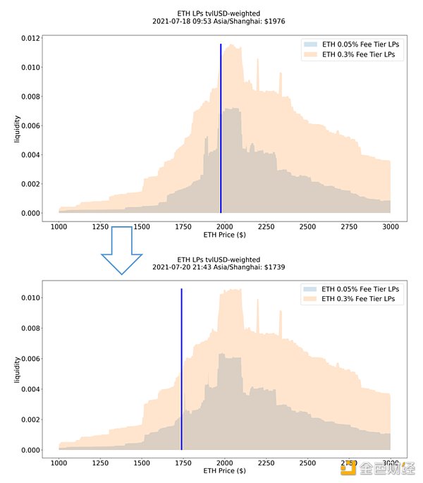 同时,通过这两天市场下跌前后的比较,我们还可以得出:LP 提供者调仓其实并没有十分迅速,很多仓位目前是在承受比较大的无常损失,这点我们可以从以下图中两个时间点的比较可以得出。