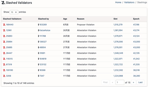 从上图(数据来源于:https://beaconscan.com/slots-slashed)可以看出,已经发生了146 起 slash 了,被 slash 的原因有 Attestation Violation、Proposer Violation。