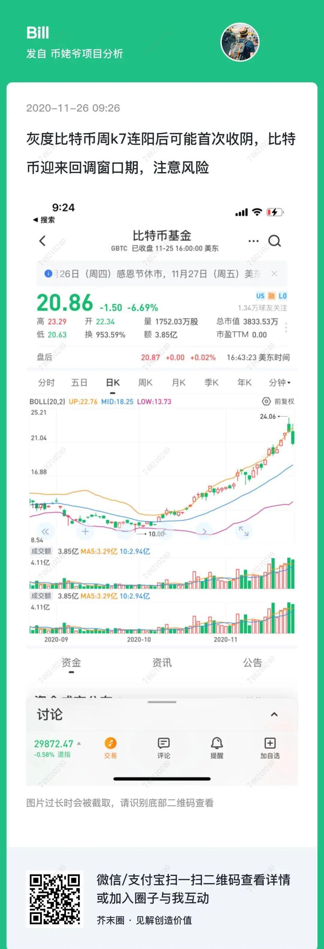 大跌之前的半个小时,Bill在圈子里提示了比特币周线收阴,迎来调整窗口期并提示大家注意风险。半小时后预测兑现。