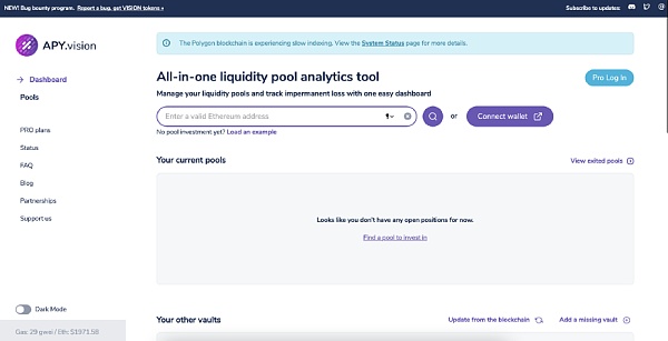 APY Vision是一种一体化仪表板和分析服务,用于管理您的 DeFi 流动资金情况并实时跟踪您的非永久性损失。它跟踪您的流动资金的进入和退出以产生洞察力。该服务是由一个小团队软件开发人员和流动性提供商构建的,他们看到了向 AMM 提供流动性的机会,并在最近推出了V2版本。