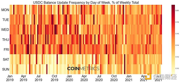 采用USDC和其他稳定币的原因有很多,但与传统结算基础设施(例如 Fedwire)相比,稳定币的一个主要好处是它们是加密原生支付,可以365天24/7全天候运行。下面的热图分解了USDC。链上数据显示,USDC主要在工作日使用,但在传统基础设施基本不可用的周末也有一些活动。