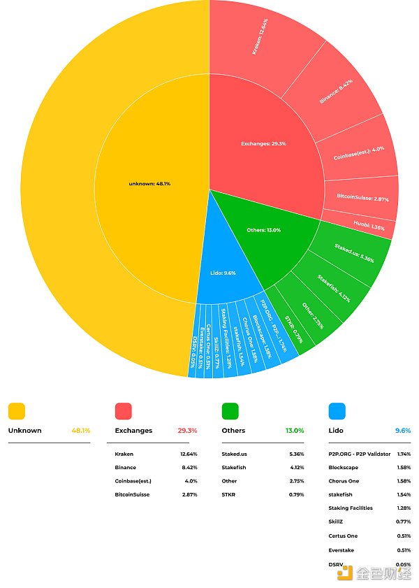 上图为Lido对以太坊信标链抵押数据的分析,从上图数据可以看到,可查证的目前抵押ETH的比例里,unknown占比48%,这些大部分来自以太坊官方客户端,其次是交易所占比为29.3%。Others代表的是一些中心化的staking工具。而最后使用Lido协议的抵押工具占比为9.6%。