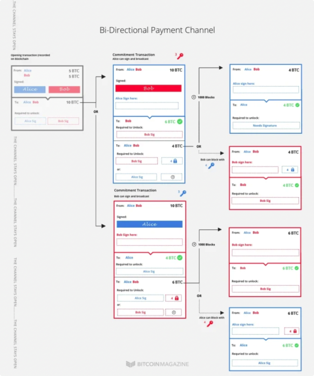 最后,只会有两笔事务被广播到比特币网络并打包进区块:开启通道事务和关闭通道事务。哪怕 Alice 和 Bob 之间发生了 100 万笔交易也是这个结果,因此极大地减轻了区块链的负担。