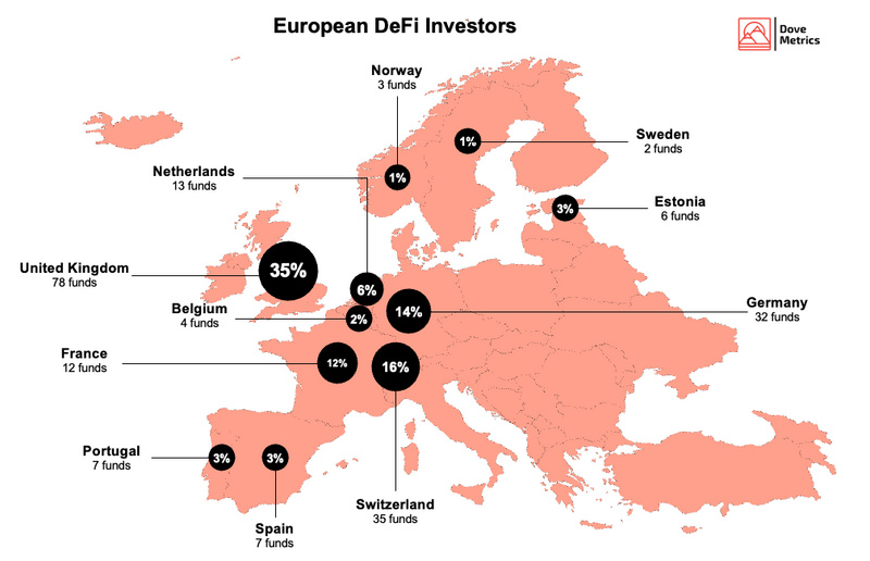 积极投资 DeFi 的基金中有 12% 位于欧洲,其中英国、德国、法国和瑞士四个国家之和占欧洲投资 DeFi 的基金总数(包含投资至少一个 DeFi 项目的基金)的 75% 以上。