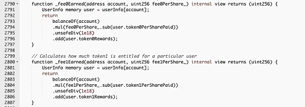 从上图我们可以很容易的发现其先通过 positionLiquidity 函数获取 tickLower 与 tickUpper 范围内合约所持有的流动性数量。然后通过 _earnFees 函数从 Uniswap V3 Pool 中收取提供流动性奖励。之后再通过 _tokenPerShare 函数计算每个 PLP 凭证所能分得的流动性奖励。最后通过 _fee0Earned 与 _fee1Earned 函数来计算用户所持有的 PLP 凭证数量可以获得多少奖励,并使用user.token0Rewards 与 user.token1Rewards 变量进行记录,如下图所示: