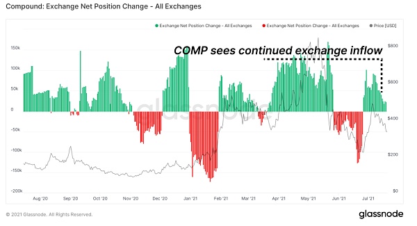 同时,像COMP这样用途有限的token一直被送到交易所持有或出售,而不是留在链上。请注意,SUSHI和COMP都是通过流动性激励来积极耕作的。一个因其在生态系统中的使用而留在链上,另一个则被送到中心化交易所。