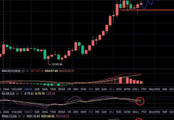 比特币昨天最高试探到了15985的位置,不过这个关口没有站稳,只是试探了下就下来了。不过灰度今天又宣布增加持仓了,这是连续17日的加持,说明了目前的价格还不算高位,上方还有很大的空间。从日先来看,K线收阳,均线整个排列组合比较健康,整体还是多头趋势不变,红色量能较昨天增加不少。下方MA5日均线15000的支撑还是比较强劲,短期这个位置如果不跌破价格还是会继续震荡向上。