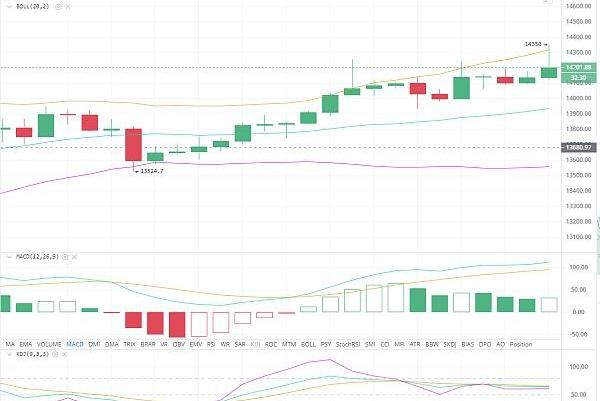 从日线上看,比特币一直走上涨的趋势,昨日突破新高最高涨到14350的位置,现在是终于稳住14000这个大关口。晚间上涨到最高点,就开始回落震荡并没出现上弹的迹象。上方阻力可以看14500点。从四小线上看现在币价稳在布林带上轨四小时线收线成纺锤线,有变盘由涨变跌的趋势,MACD快慢线上移绿色动能柱开始逐渐放量,KDJ三线似乎要开始聚拢的形态而小时线则更加明显,综合这些指标上分析,今天的行情肯定会有一波回落,建议大家操作上高空低多带好止盈止损。雅晴:LXS2051