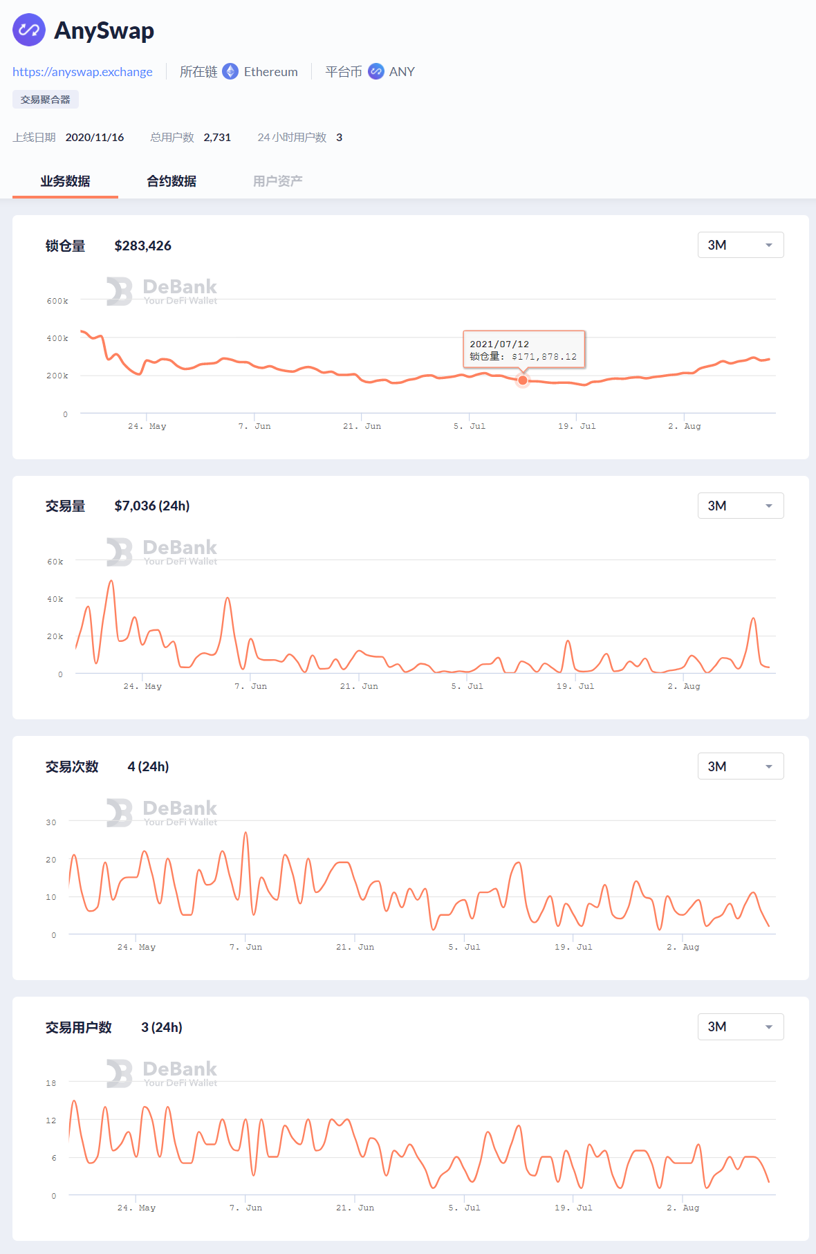 根据 Debank 数据显示,Anyswap 的锁仓量、交易量并没有因为黑客攻击而受到影响,反而有所上升。交易次数和交易用户则呈现略微下降。
