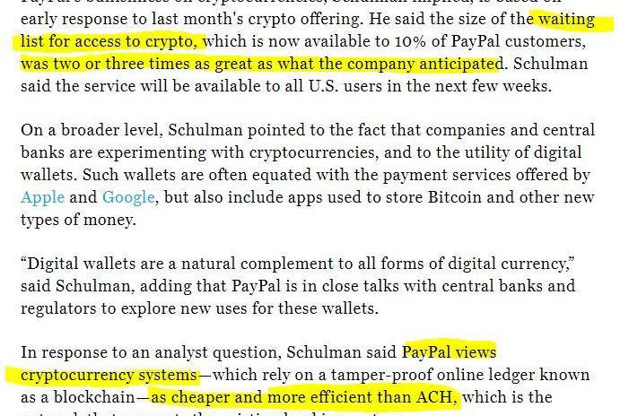 另外,PayPal看好加密货币,因为上个月宣布推出加密货币服务得到了用户的积极回应。用户的购买额度从1万美元每周提高到1.5万美元每周,申请加密货币服务的用户数也达到了预期的两到三倍。尽管目前仅有10%的PayPal用户获得了加密货币服务,但未来几周内,服务范围将扩散到全美所有用户。而且,PayPal将于2021年上半年向国际用户开放加密货币服务。