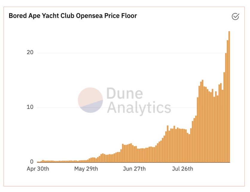 虽然近期NFT市场的明星是Art Blocks 和「生成艺术」,但似乎所有NFT项目都迎来了爆发,几乎所有的NFT都处于up-only的模式,而没有停止的迹象。