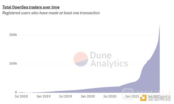 截止今年4月份,OpenSea的总用户量为105,621,随后截止5、6、7月份的总用户量分别为:119,996、142,253、174,357;而截止8月19日,OpenSea的总用户量为253,354。8月份的用户量增长超过了此前四个月的用户增长之和。