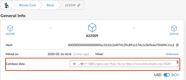 在BCH区块高度622509,矿工SBIcrypto.com留下信息,直接表示No,链接是上面Bitcoin ABC的公告。(见下图)
