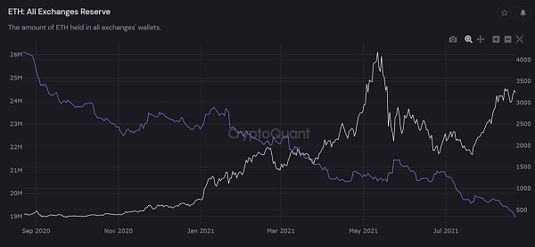 交易所内储备的ETH余额创出近新低,当前存量为1900万枚