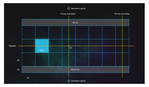 Evolution Land 共包含 26 ?陆,26 个?陆中,其中有 24 个?陆 包含 2025 (也就是 45x45)个地块,另有两个特殊的?陆包含 7921 (22x360 + 1)地块,每个地块为 100? x 100 ?。总地块数量为,360×(135+44)+2=64442。由于地貌因素的存在,可拍卖地块数量将会少于总地块数量。